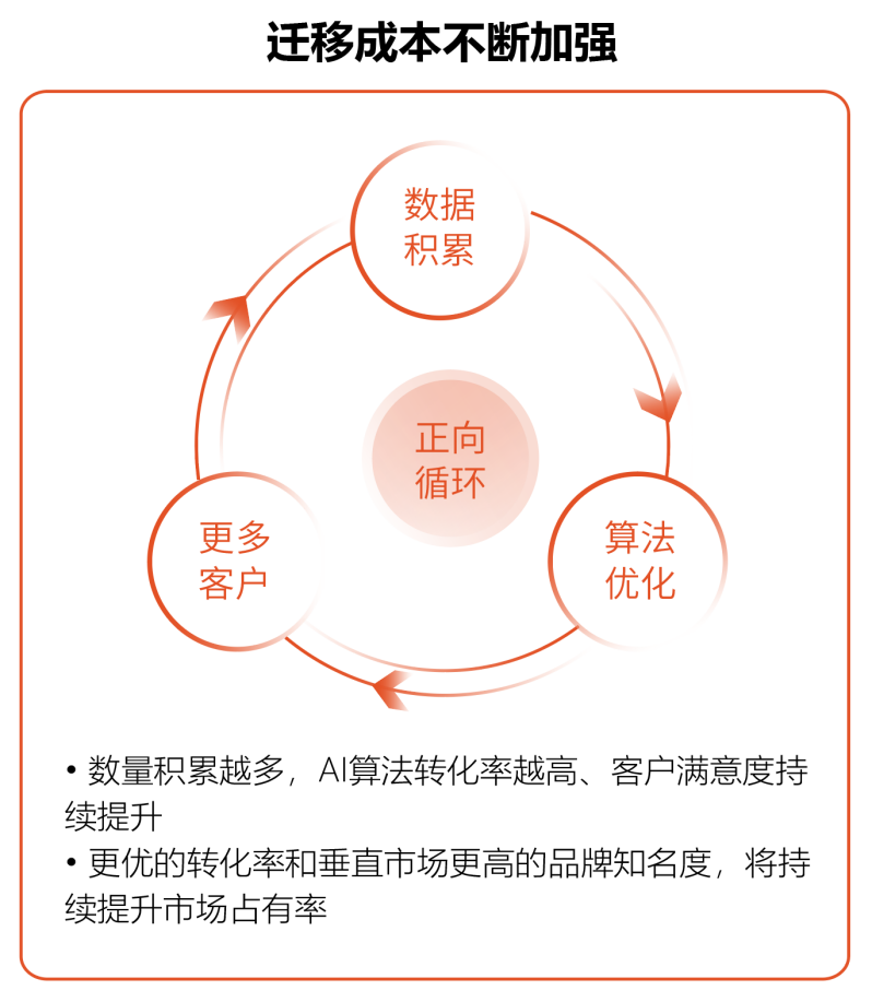 出色的算法技术基础,以及海量的数据积累,完全可以成为一家AI客服服务商的壁垒所在。一方面,最优的算法、最丰富的数据,可以打磨客服机器人的会话能力和转化能力,更高的转化能力必然获得更多的企业客户,更多的客户也将进一步完善其数据积累,并进一步反哺算法研发,并最终形成良性循环。在这一过程中,头部的AI客服服务商将进一步巩固自身优势,行业资源也将继续向头部企业集中。