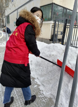回家吃午饭的路上,我看见主要路面已经被扫雪车打扫干净,马路牙附近还有部分结冰,特别是健身器材附近还有积雪,那可是爷爷奶奶们经常去锻炼的地方啊! 想到这里,我脱下羽绒服和围巾,急匆匆地拿起铁锨,一锨一锨的铲,再用大扫帚,左一下接着右一下认真仔细地扫,直到水泥地面完全干净裸露出来,我才擦干额头上的汗水,带着饿的咕噜咕噜叫的肚子,回家吃饭去了。等到下午,便又开始了新的一轮忙碌,连续七天,皆是如此。