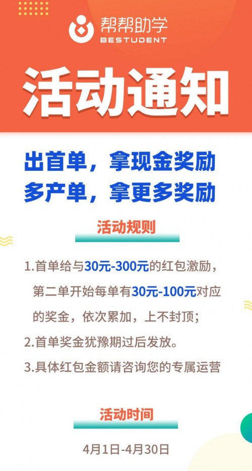 只要在活动期间加入帮帮助学非金融分期平台的新入驻商户,首次经平台达成分期订单,即可获得30~300元现金奖励红包,此后的每笔成单均可获得30~100元对应奖金,依次累加,上不封顶!
