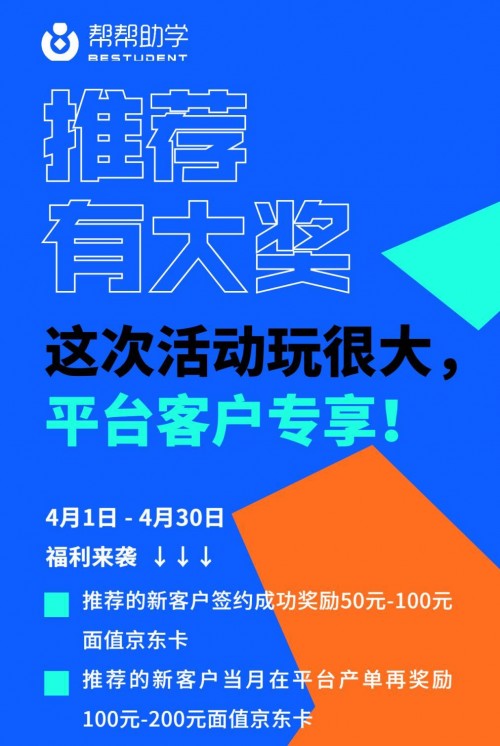 每成功推荐入驻一家(同一机构不同分店算多家),即可获得推荐奖励50-100元京东卡一张!同时,被推荐机构当月在帮帮助学平台为客户、学员成功开通分期交易,推荐人还可再获得100-200元京东卡!