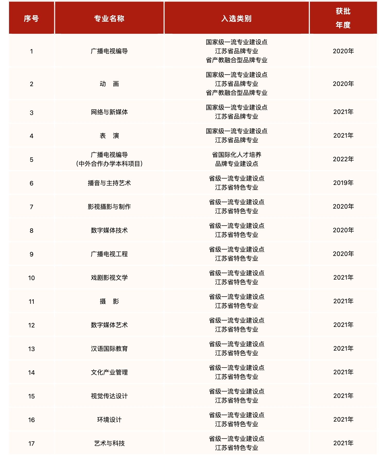 近日,南京传媒学院专业建设喜获国家级及省级多项荣誉,取得一系列标志性成果和重大突破。据教育部办公厅《关于公布2021年度国家级和省级一流本科专业建设点名单的通知》(教高厅函〔2022〕14号),该校新增网络与新媒体、表演2个国家级一流本科专业建设点,戏剧影视文学、摄影、数字媒体艺术、汉语国际教育、文化产业管理、视觉传达设计、环境设计、艺术与科技等8个江苏省一流本科专业建设点。