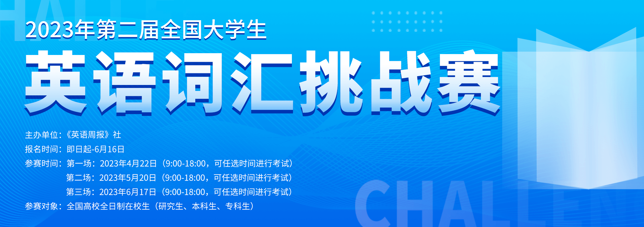 为贯彻落实教育部《关于加快建设高水平本科教育提高人才培养能力的意见》等文件精神,激发大学生学习英语的兴趣,担当铸魂育人使命,为全国在校大学生提供展示英语词汇水平和能力运用的舞台。经研究决定,英语周报社特举办“2023年第二届全国大学生英语词汇挑战赛”。