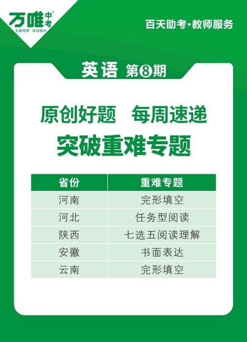 为使师生在中考前更加精准、高效地备考,3月15日—6月9日期间,万唯中考持续为河南、河北、陕西、安徽、云南5省区初三师生推送七科原创好题等资料,截至目前,已有超3万名老师每周通过所在的微信群获取。