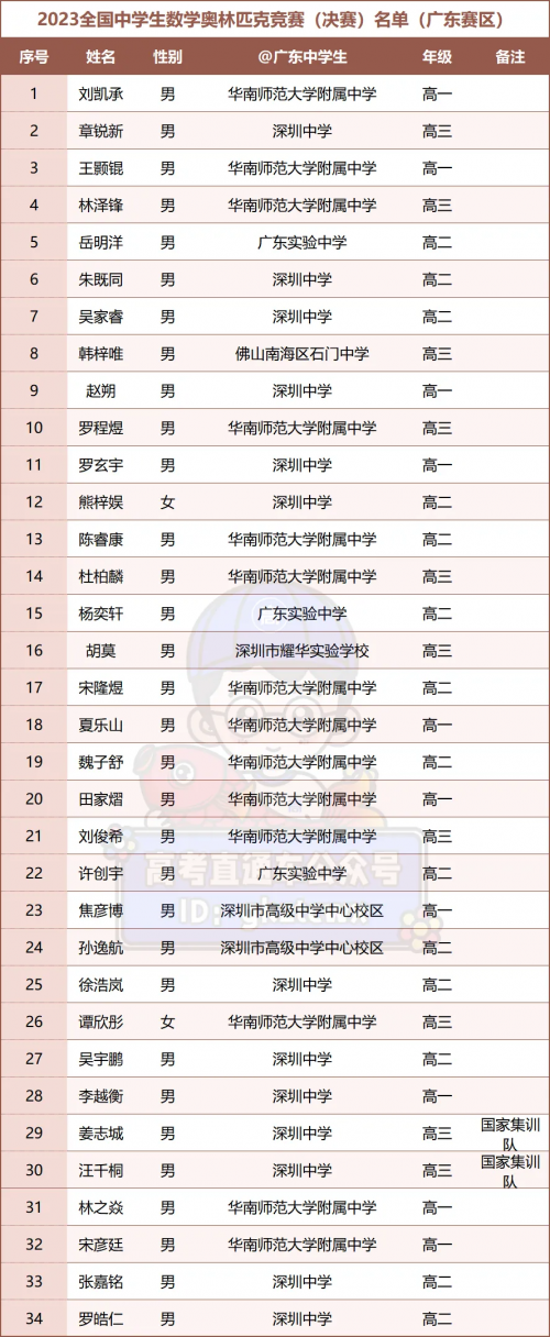 目前,广东省数学会已经公布了2023年全国高中数学联省队及省一、省二、省三获奖名单。其中,广东有34人进入决赛,93人获得省一等奖,省二353人,省三413人。恭喜获奖学子,下面一起来看2023年数竞(广东赛区)获奖情况!