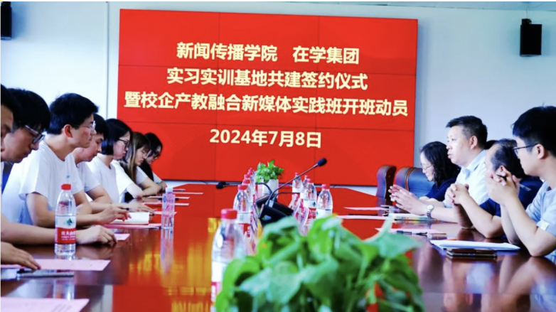 在积极响应国家关于深化产教融合的号召下,加速产教深度融合改革 实现产业教育'双向奔赴'" 南京晓庄学院新闻传播学院与行业领先的江苏在学信息科技有限公司(简称在学集团)正式签署合作协议,并共同举办了新媒体实战班的开班仪式。此次合作标志着双方在人才培养、科研创新和就业服务等方面建立了长期、深入的合作关系。双方在培养新媒体专业人才领域迈出了坚实一步,旨在通过理论与实践的深度融合,为学生搭建一个高效学习与实践的平台。