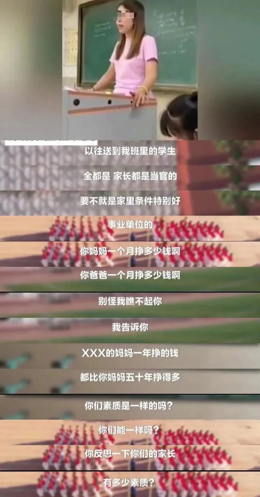 这名女老师先前曾被该校评为“最美教师”,并曾多次被评为津南区数学学科优秀教师,没想到却被录下对学生的歧视言论,录音档里可以听见该老师先是夸耀自己:“以往送到我班里的学生,家长都是当官的,要不然就是家里条件特别好”,然后接著质问学生:“你爸妈一个月挣多少钱,别怪我瞧不起你!XX的妈妈一年挣得钱都比你妈50年挣得多,你们素质能一样吗?”
