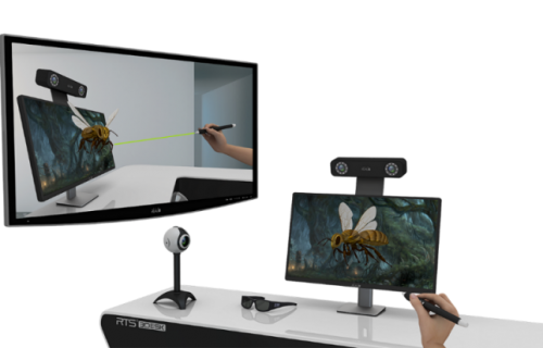 RTS-3DESK是智能3D立体交互系统应用于桌面型3D交互的一种产品形态,主要是基于RTS-DINO双目红外光学相机系统来实现三维定位,通过轻量级的交互笔对全息3D场景内容实时操控,将3D显示载体用桌面式3D显示设备呈现,进而构建出一套可交互的桌面式全息3D显示系统。