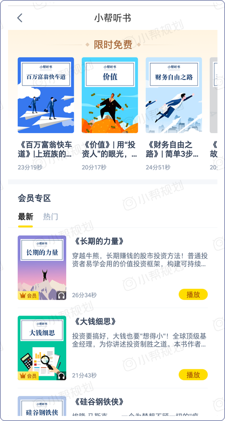 据介绍,小帮听书项目上线以来,现已发布近30本好书,近期还有近20本将上线,书目主要选取投资理财、励志、管理类的经典著作,人们熟悉的《大空头》《价值》《周期》《九型人格》等均在列,现每周五都会有新的书目上新供会员阅读。面对非会员,小帮每月也会更新1本可以听的限免书籍,截止目前已接近10本。