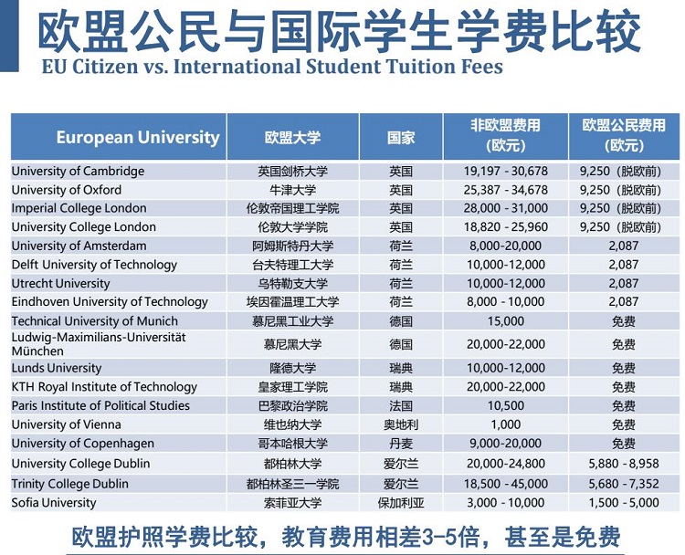 欧盟身份学生与国际留学生的学费差比日益拉大,大多数欧洲国家对欧盟学生采取免学费政策,而非欧盟学生则要负担少则1万、多则10万一年的学费。