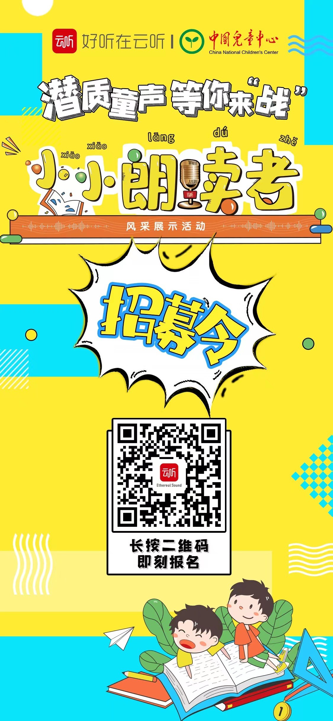 更多活动有关信息、赛制奖项、比赛流程、拟邀嘉宾名单,都在云听APP端内可以查看。即日起进入云听客户端,通过“小小朗读者”活动页面即可进行报名。或者扫描下方海报二维码,立刻报名。你的优质声音,请让更多的人倾听!