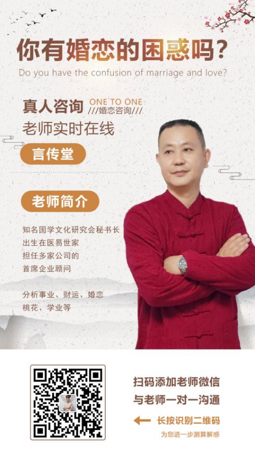 言传堂,1967年出生于传统易学世家,精通易理,习得玄门五术,山医命相卜皆了然于心,从业至今已有34年之久,曾帮助数百家企业、上万名顾客,进行命