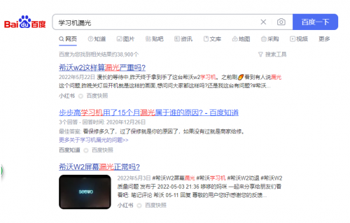 在百度以“学习机 漏光”为关键词搜索,排在第一位、第三位的搜索结果,就是希沃W2的漏光问题。