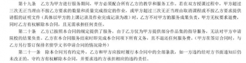 在咨询了法律顾问后,记者发现这家机构的合同中还藏有不少陷阱和不等平条约。例如,在违约责任的第二十条款“乙方按合同规定提供服务......不对甲方申请院校的结果负责......且不退还任何服务费”,其中乙方服务阐述并不明确,合同只列明了乙方所提供的服务,但并没有阐明服务的质量要求,如中途不更换老师,课后及时答疑、作品集教学质量等问题,关于退费标准和退费比例的描述也存在模棱两可、偷换概念的情况。