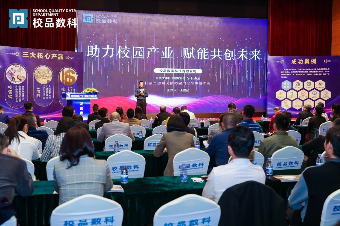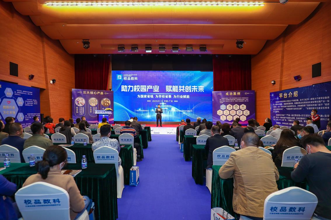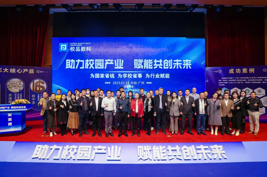 网讯:在校园产业高速发展的过程中,教育数字化转型面临哪些挑战?如何推进智慧校园建设?如何推动校园建设数字化转型?2023年1月14日下午,一场校园产业行业盛典在广州市番禺区天安科技园会议中心举行。广东省和广州市政府相关部门负责人、人大代表、银行机构领导、慈善基金会等领导以及华为、希沃、海康威视、金陵体育、双鱼体育等上百家校园产业企业相聚在这里,举行“助力校园产业 赋能共创未来”的校园产业发展趋势分享暨产品发布活动。主办方校品数字科技有限公司王昌品董事长出席会议并致辞,王总同时分享了校园产业的发展趋势、行业痛点及企业未来的发展方向。CEO邓雄先生对公司旗下四大版块的“校爱购”、“云渲师”、“校中宝”、“校园产业商学院”做了介绍。