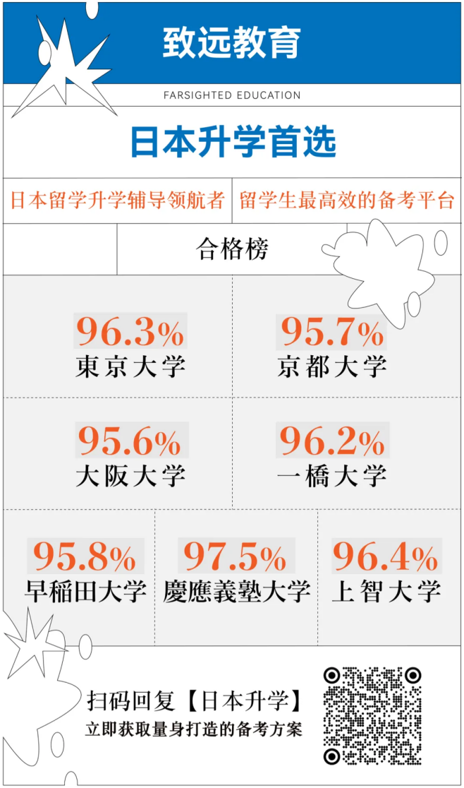 今天的分享就到这里了,致远教育致力于帮助日本留学生跃升日本名牌大学,在直考,大学(学士)和大学院(硕士)进学方面有着丰富经验和业内顶尖的师资,熟稔各学校的考试规律和出题趋势,通过提供专业指导,我们已帮助上千名学生实现了学历跃升的梦想,在日本升学教育方面经验和实力有目共睹,在留学生中有着极高的口碑和傲人的合格实绩。