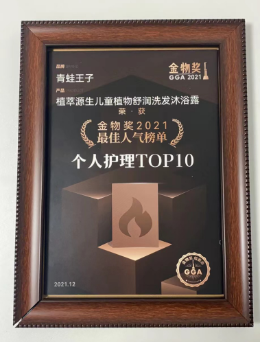 本次2021金物奖,青蛙王子植萃源生儿童植物舒润洗发沐浴露和爱芽星-正畸专用声波电动牙刷共同荣获金物奖最佳人气榜单个人护理TOP10。