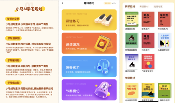 小马AI陪练针对上述痛点,通过AI琴音识别技术和趣味化的产品设计,为琴童建立弹琴的自信心、激发他们的练琴兴趣,能够通过陪伴以专业的纠音能力和精准的测评系统,指出弹奏中的问题,让琴童们实现高效练琴。