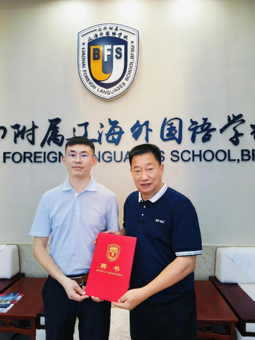 北京外国语大学附属辽海外国语学校校长王向阳向张世龙老师颁发聘书,聘任为校董。