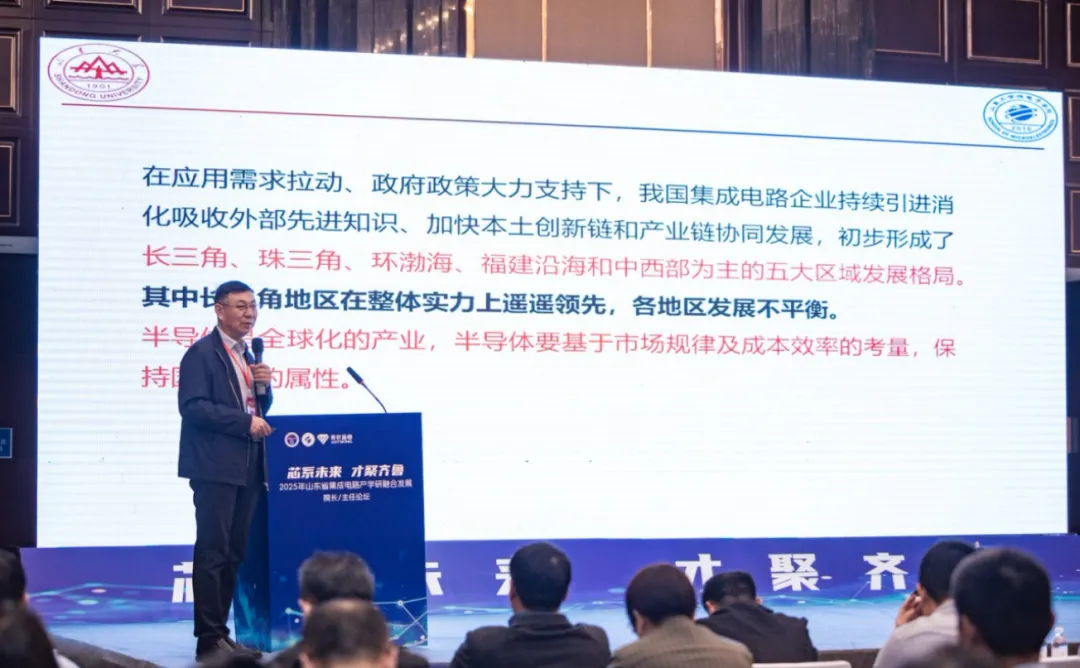 山东集成电路产业技术创新战略联盟理事长王卿璞以《中国半导体集成电路产业解析》为题进行报告。他从宏观角度出发,全面分析了中国半导体集成电路产业的发展现状、市场格局以及未来趋势,让参会人员对整个产业有了更为清晰和全面的认识,为高校和企业制定发展战略提供了重要依据。