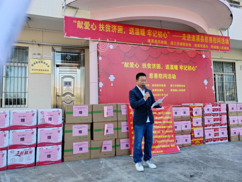 为帮助困难群众度过一个幸福祥和的新春佳节,弘扬爱心善举,营造公益氛围,《献爱心 扶贫济困,送温暖 牢记初心》迎新春慈善慰问活动于2024年1月15日在遂溪县成功举办。活动得到了14家爱心企业的大力支持,共送出了32000元慰问金和800份物资(包括100袋大米、100箱牛奶、100瓶花生油、200包腊肠、100箱水果、100瓶洗衣液、100副眼镜)。