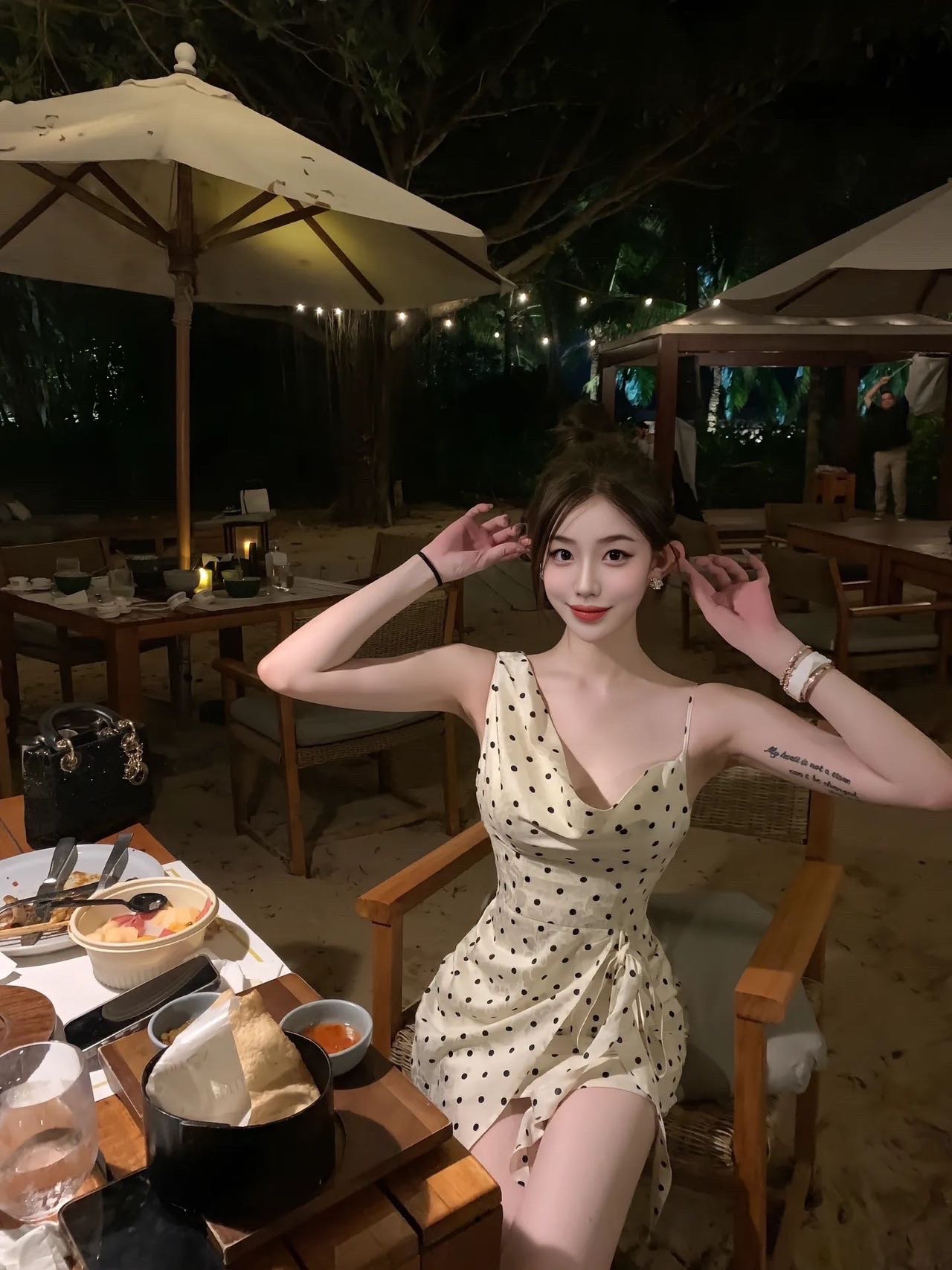 还有那身波点吊带裙,同样是性感风格的绝佳诠释。单侧吊带的独特设计打破常规,深V领口延伸至恰到好处的位置,露出白皙的肌肤,营造出撩人的氛围。黄底黑波点的经典组合,复古中透着俏皮,短裙的长度将修长美腿展露无遗。在户外用餐的场景里,她自在地摆弄头发,随性又迷人,将性感与休闲完美结合,充分展现出在轻松氛围中也能驾驭的性感魅力。