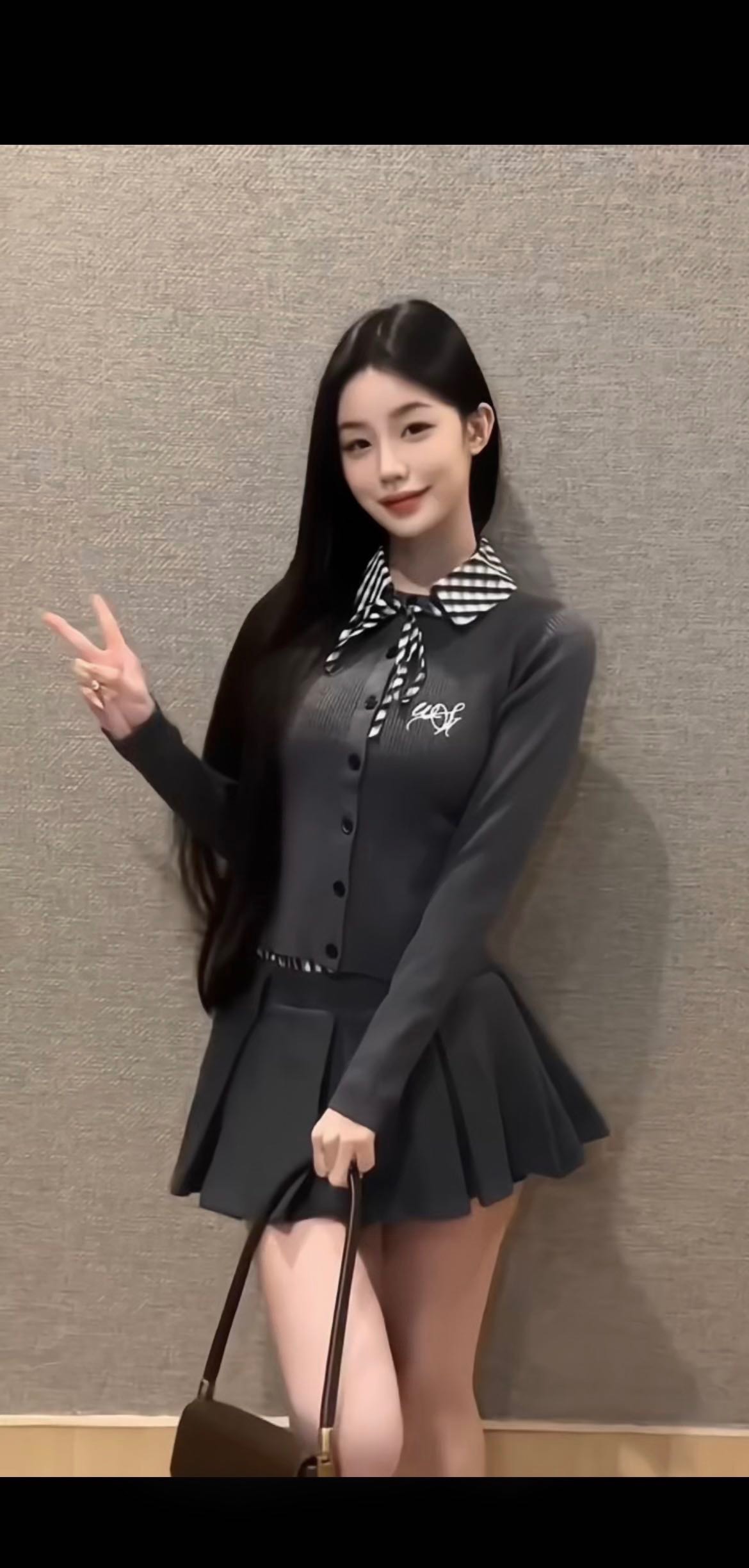 在可爱风格的穿搭上,彤彤也有着自己的独特见解。她的灰色学院风套装堪称经典。灰色针织开衫简约而不失质感,修身的版型勾勒出姣好的身材曲线。黑白格纹领结作为点睛之笔,瞬间为整体造型注入了学院风的灵魂,增添了几分俏皮与可爱。搭配上同色系的百褶短裙,少女感十足,短裙的设计又巧妙地拉长了腿部线条,展现出青春活力。她手拿棕色包包,比出可爱的手势,每一个动作都散发着纯真与朝气,这种可爱风格的穿搭让她仿佛从校园漫画中走出的女主角,深受年轻粉丝的喜爱,也成为了校园风穿搭的灵感范本。
