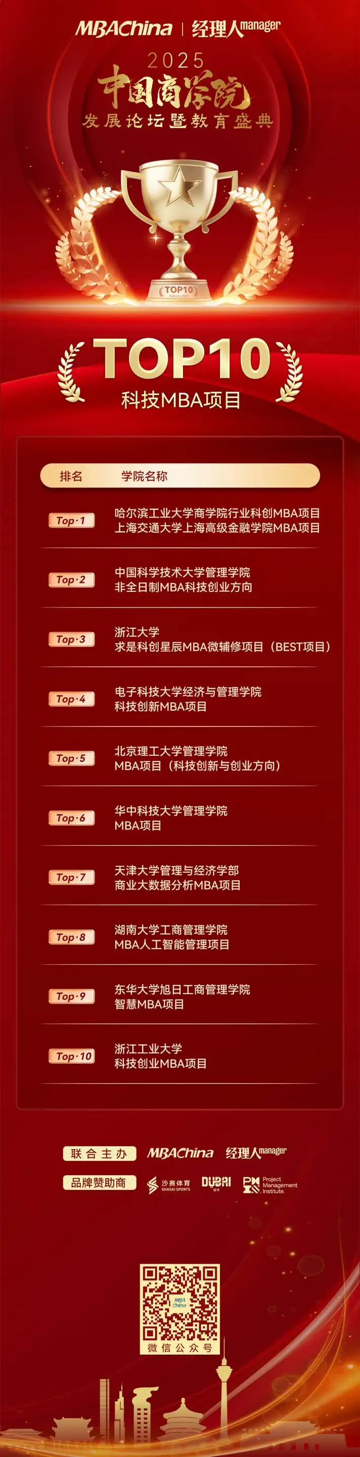 “中国商学院科技MBA项目TOP10”榜单由MBAChina与《经理人》杂志联合发布,并收录于中国知网,是中国MBA教育领域极具权威性与影响力的排名之一。该榜单既是商学院优化科技 MBA 项目建设的核心依据,更将成为引领商学教育跨界创新、助力复合型人才适配数字经济发展需求的重要指引。